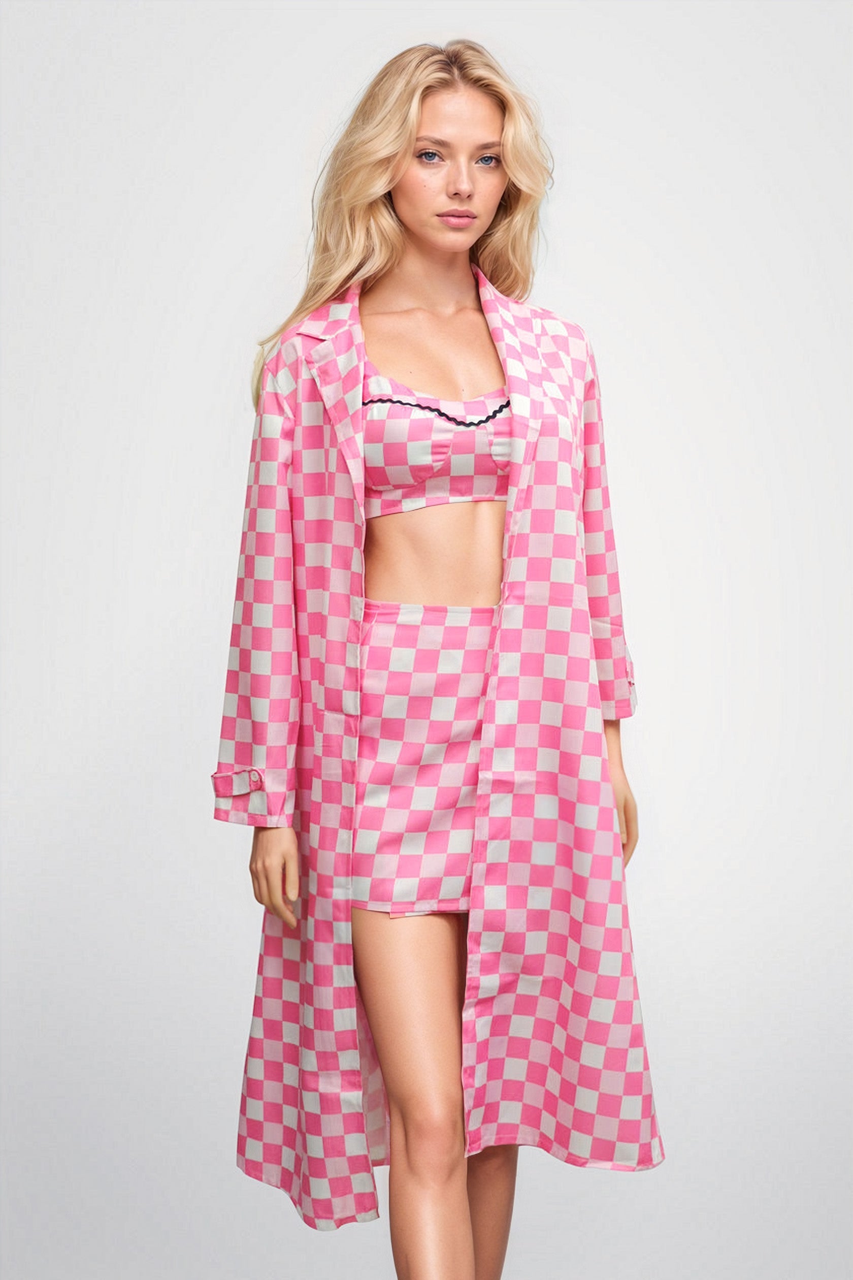 Cover up in this Beach Doll Cover Up costume featuring a patterned top with bust detail, matching skirt, and oversized cover up robe with belt.