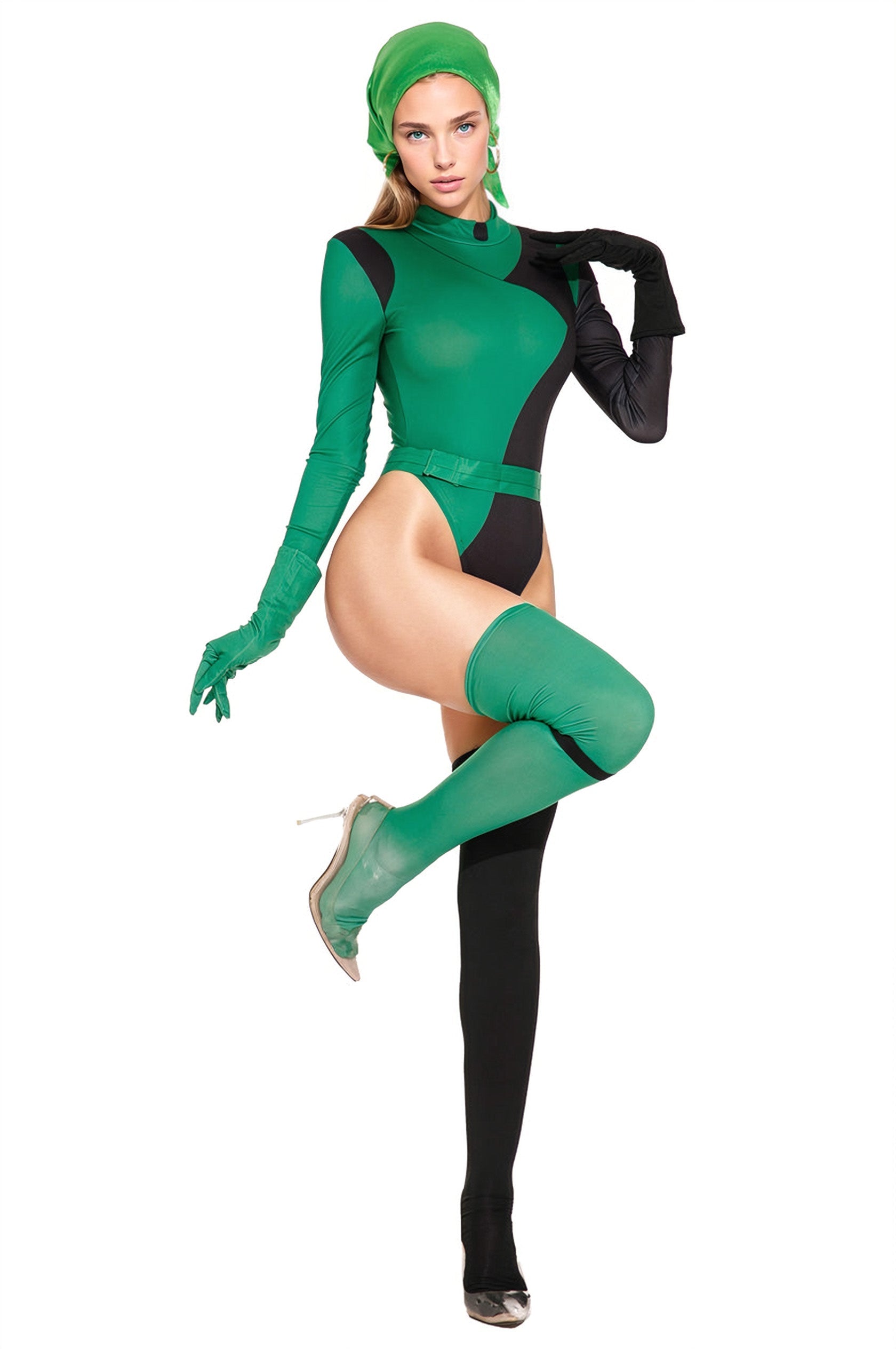 This Impossible Woman costume includes a black and green print bodysuit with long sleeves, gloves, and leg accessories.