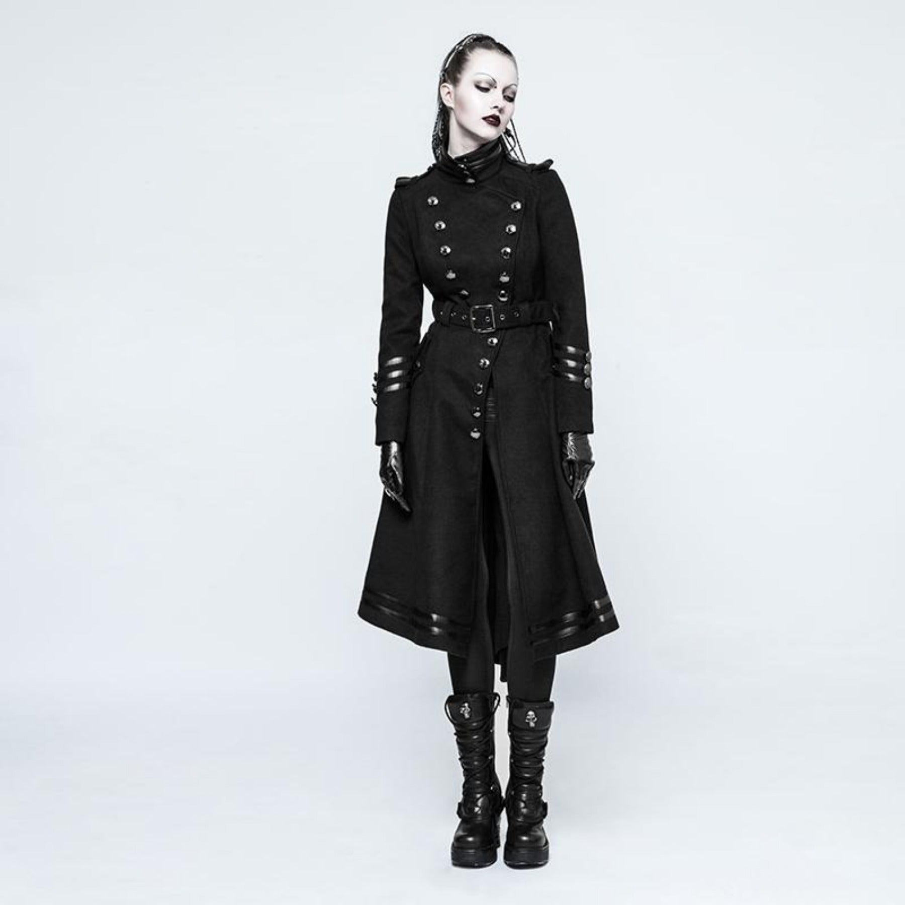 An epic military style long coat with the coolest buttons and faux leather stripes design.