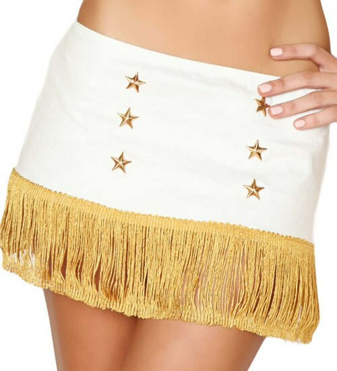 Ahoy captain! This sexy Private Captain Halloween Costume could be a military look or you could be the captain of your own ship. It's so cute and sexy, featuring a white mini skirt with gold fringe and gold stars, a bra top with gold studs, star and gold fringe on the arms, and to "cap" it off a white sequined hat with gold rope and gold embroidered star. Wear this sexy captain costume for Halloween, theme parties, a yacht party and bedroom fun.