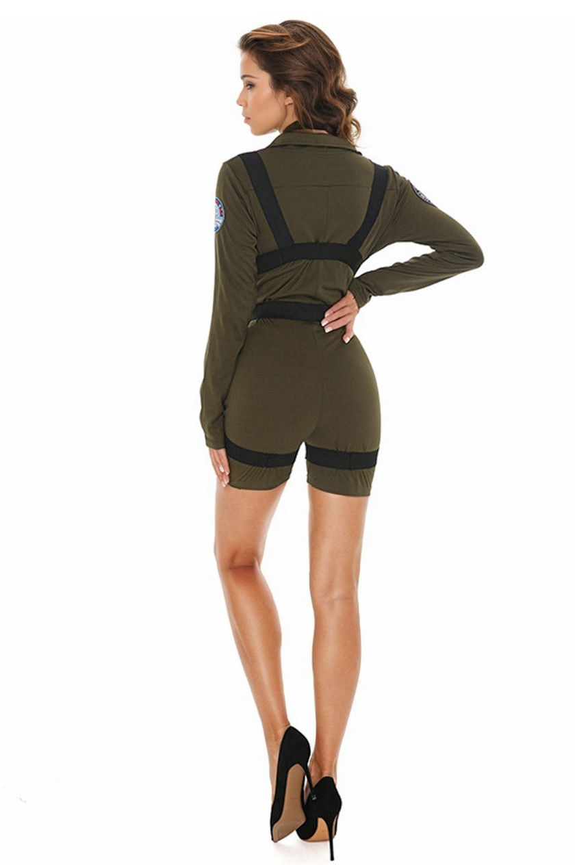 This Sexy Paratrooper Halloween costume includes a khaki green bodysuit with long sleeves, a zip up front, patches, and black harness.