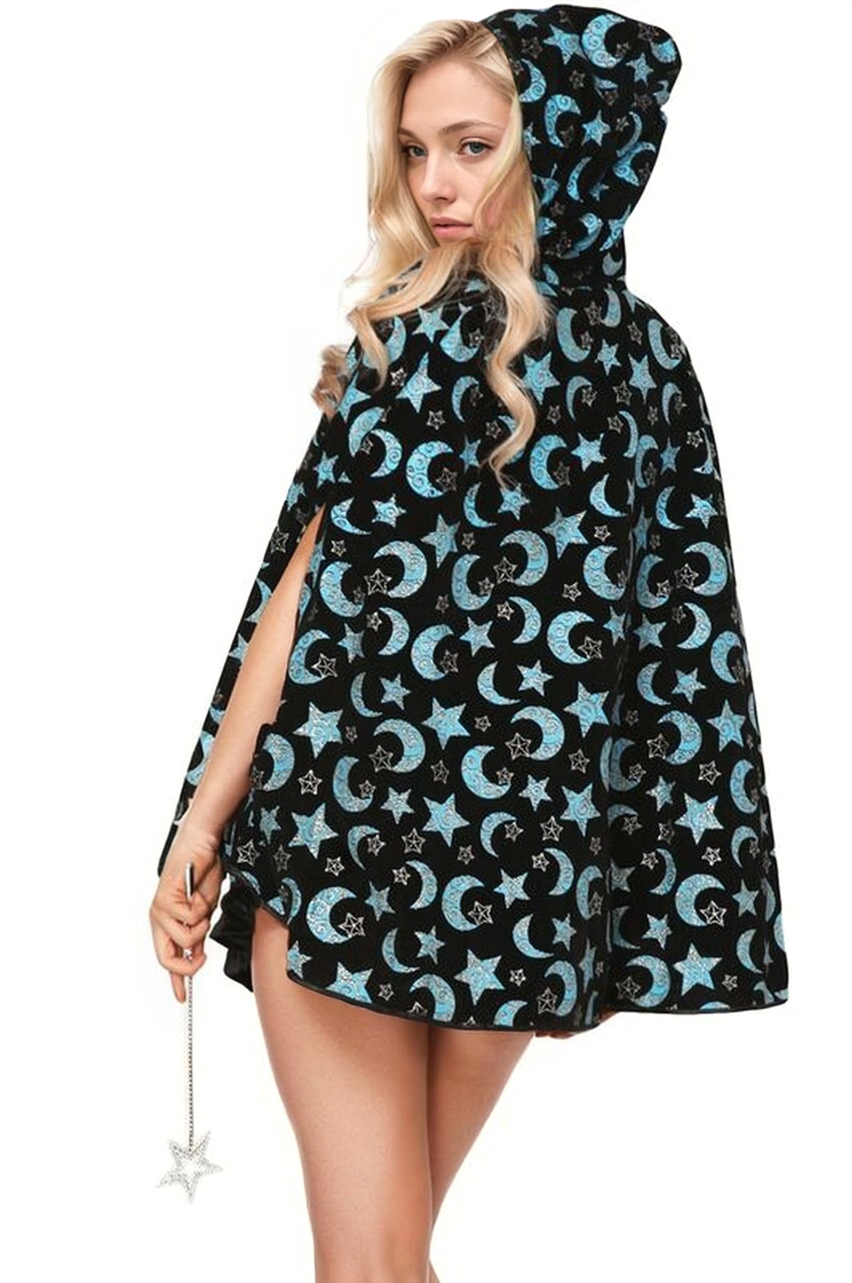 Four Piece Sorcery Costume includes Hooded Velvet Cloak with Glitter Moon and Star Details, Stretch Velvet Top with Rhinestone Embellishments and Faux Front Tie, Matching Mini Skirt with Attached Belt with Rhinestone Star Buckle, and Wand.