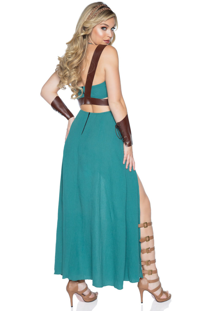 This four-piece Warrior Maiden costume includes a gauze dress with high cut slits, O-ring detail, a faux leather buckle shoulder harness and matching arm cuffs.